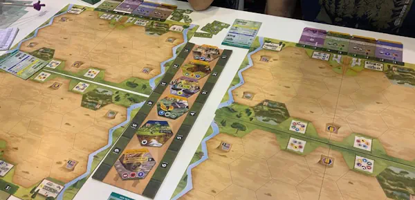 Ensuite, c’est le drame : le jeu mauvais. Il fallait bien que cela arrive, vu le nombre de jeux essayés. On se lance sur Theocratia (Mojito Studios), parce que « oh, il est beau le plateau ! », et malgré une explication plutôt claire, Raphaël et moi passons à côté de la partie. Il en va de-même pour nos partenaires de jeu italiens. On arrête au bout d’une manche, mais par choix cette fois-ci.